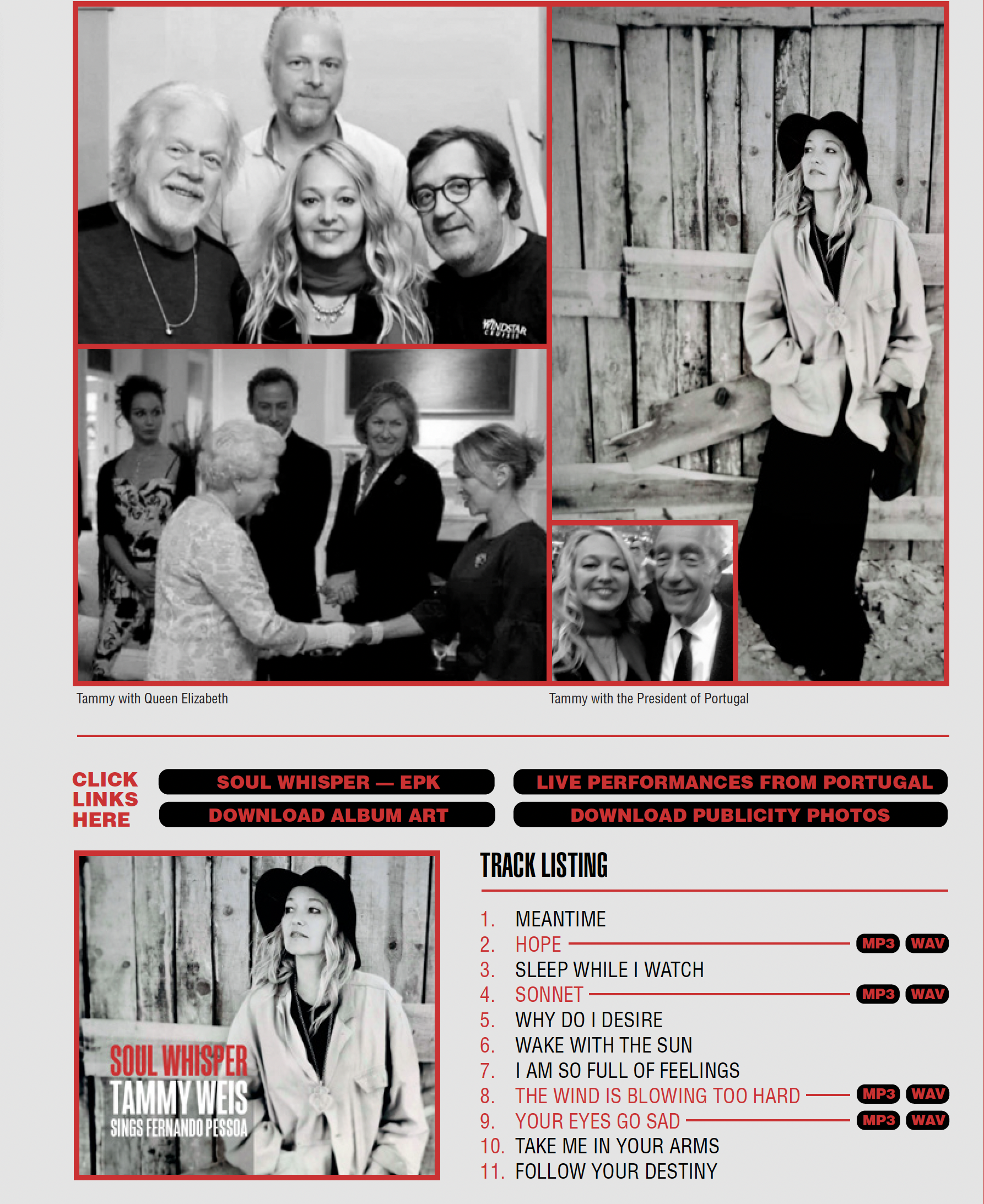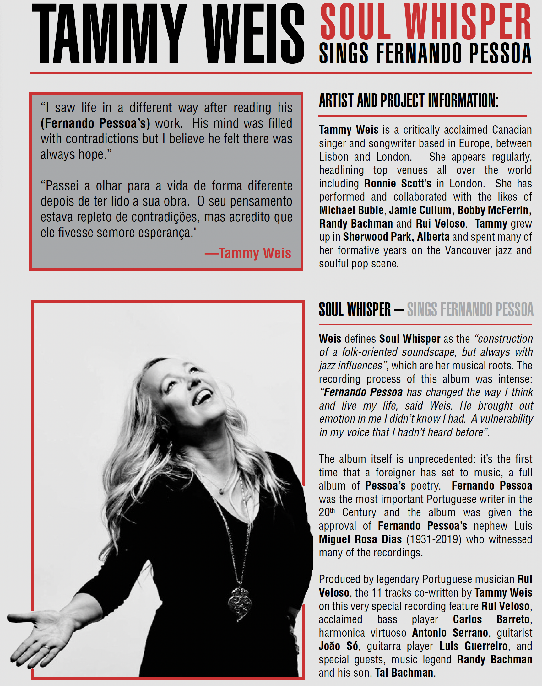Weis defines Soul Whisper as the “construction of a folk-oriented soundscape, but always with jazz influences”, which are her musical roots. The recording process of this album was intense: “Fernando Pessoa has changed the way I think and live my life, said Weis. He brought out emotion in me I didn’t know I had. A vulnerability in my voice that I hadn’t heard before”.