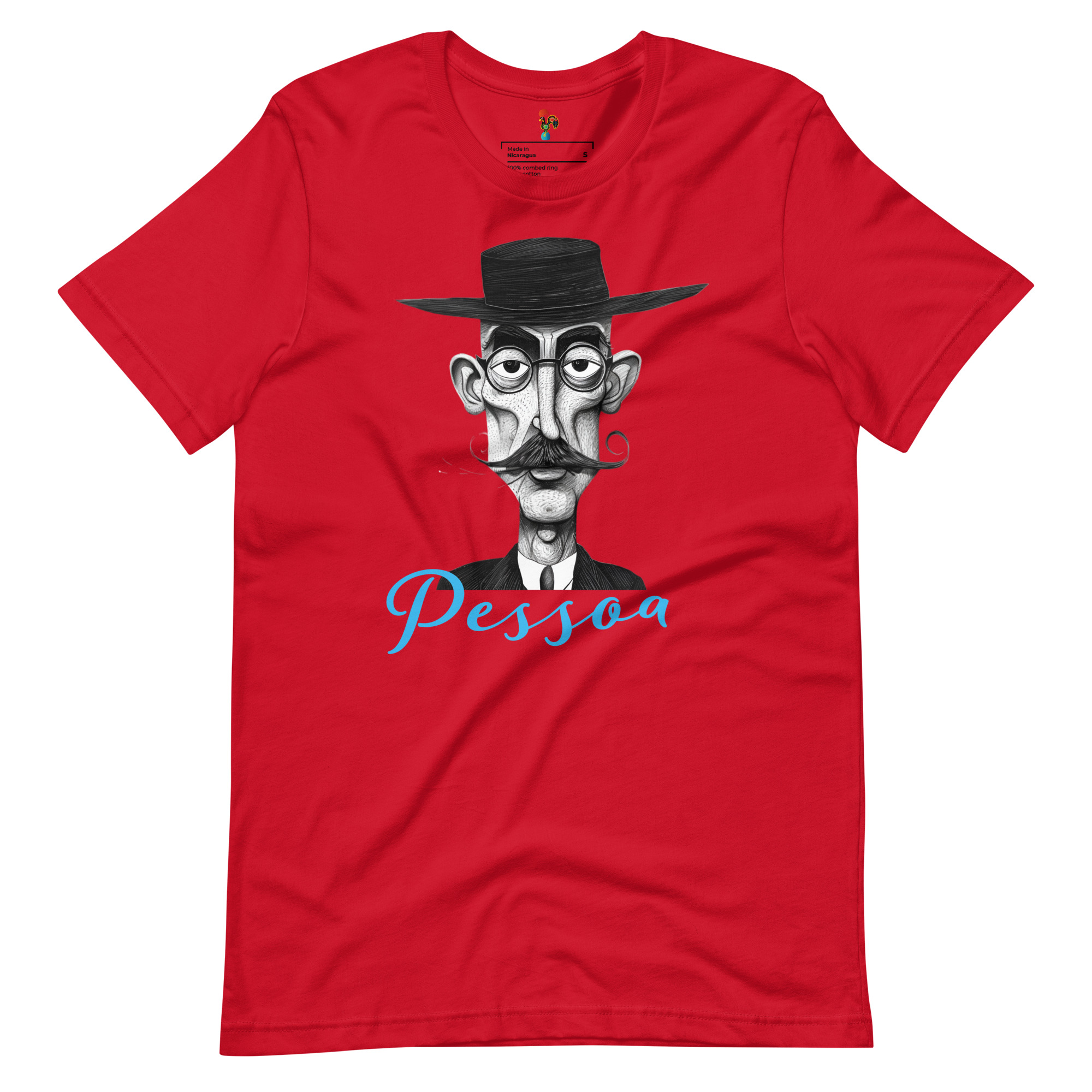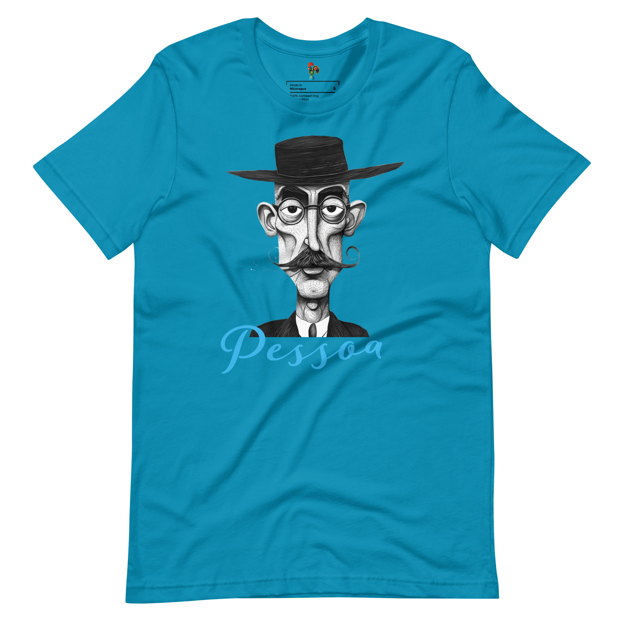 The front of the shirt showcases a charming caricature of Pessoa, capturing his enigmatic persona and poetic spirit. On the back, a poignant quote from his masterpiece, “The Book of Disquiet,” adds depth and meaning to this timeless garment: “I wasn’t meant for reality, but life came and found me.” – Fernando Pessoa.