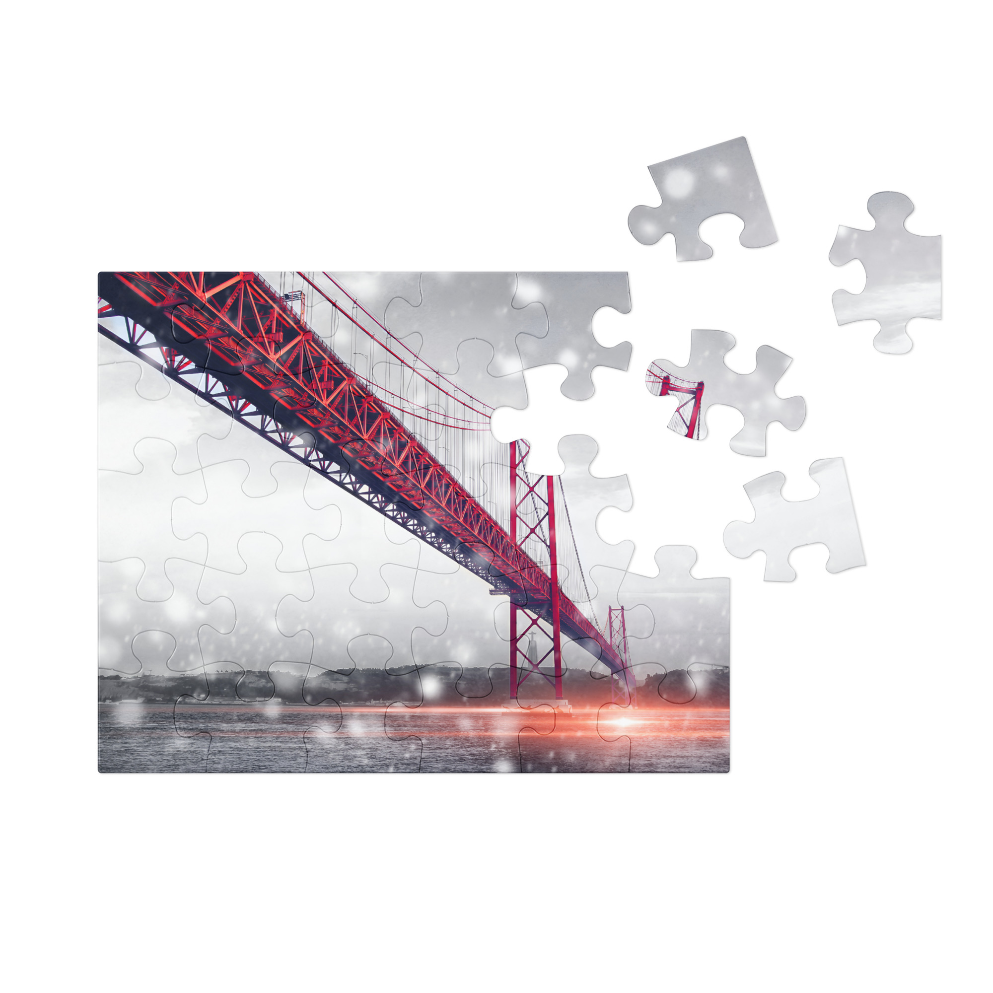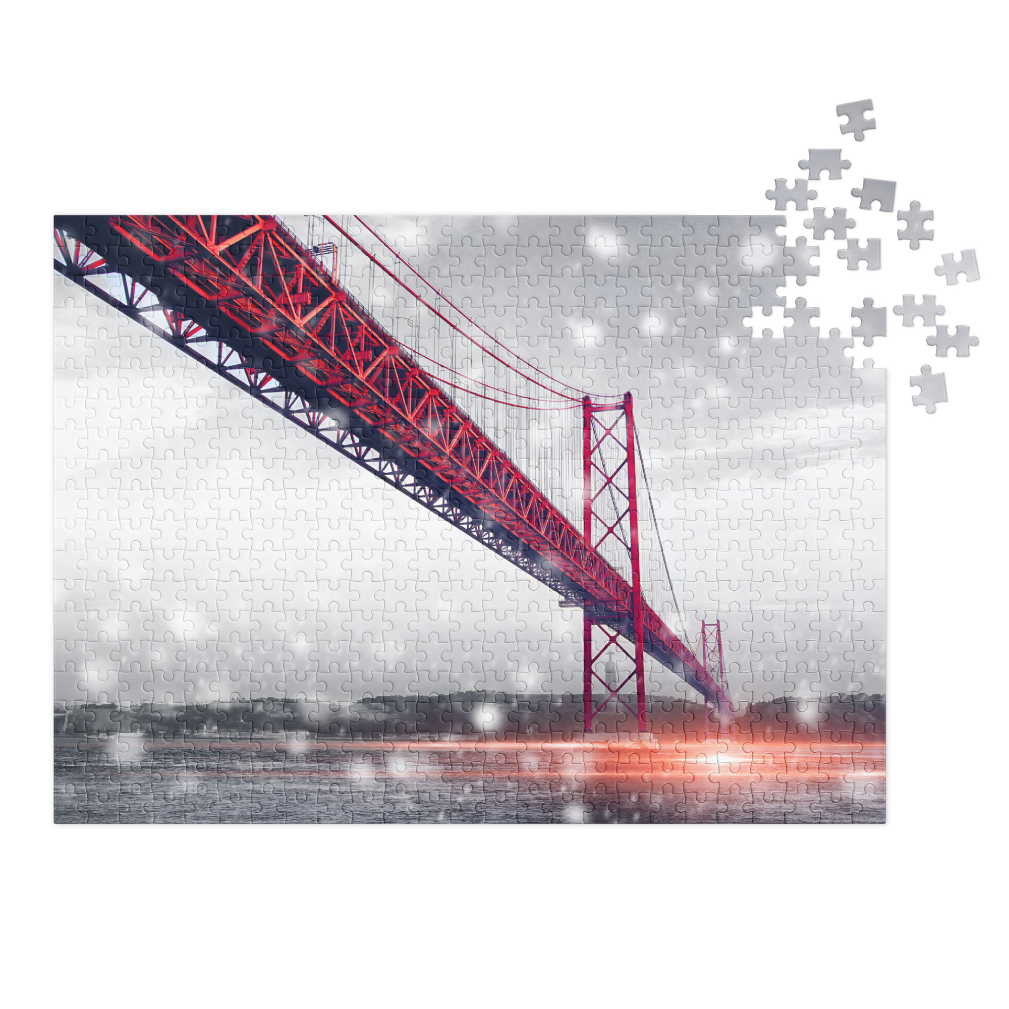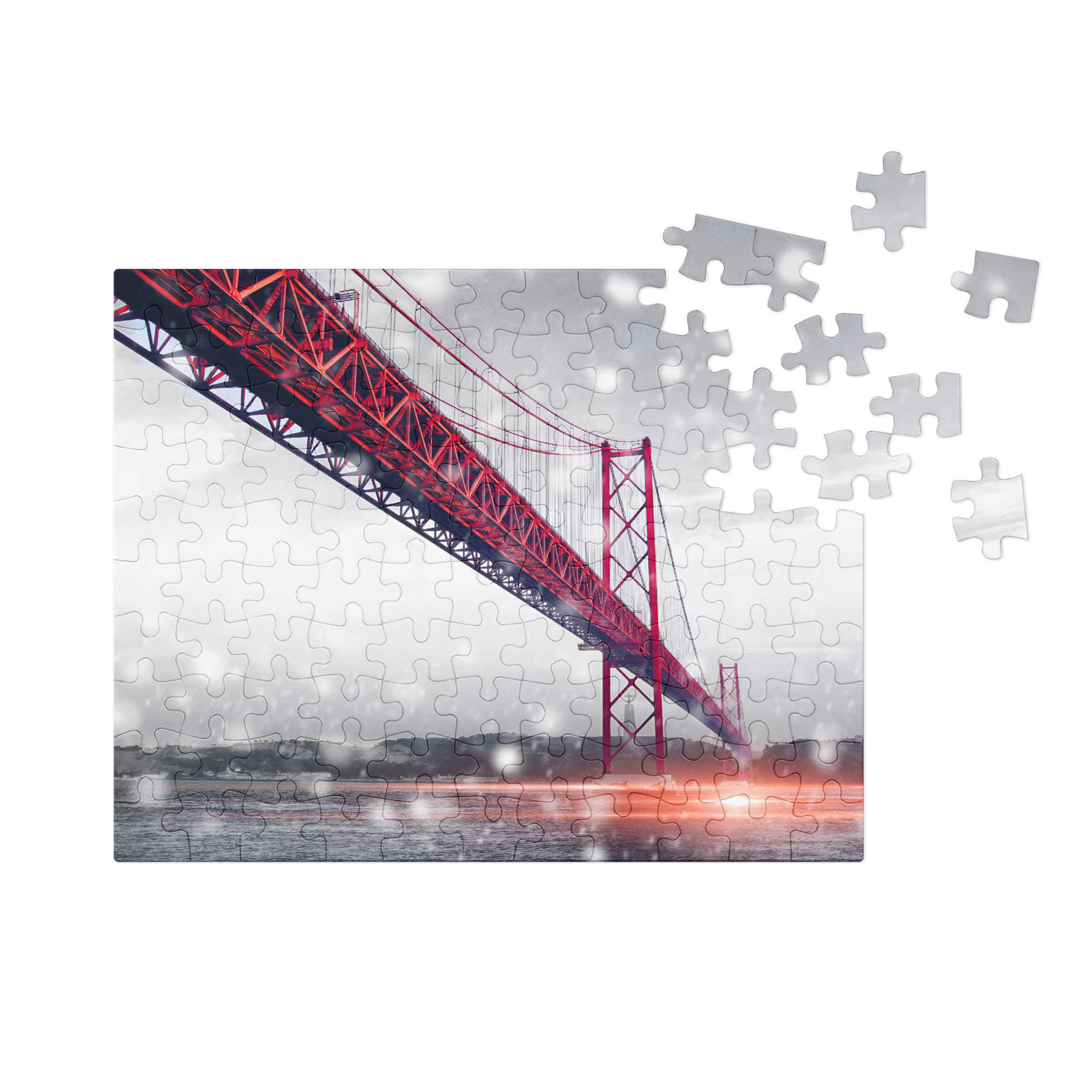 Piece together one of Lisbon’s most iconic landmarks with this beautifully designed Lisbon jigsaw gift puzzle featuring the April 25th Bridge (Ponte 25 de Abril). Perfect for a Lisbon gift for puzzle lovers, travelers, or anyone with a soft spot for Portugal, this glossy Lisbon jigsaw gift puzzle comes neatly packed in a stylish white metal tin with the finished image on the lid—ideal for gifting or safekeeping. Once complete, it’s a stunning piece worthy of framing.