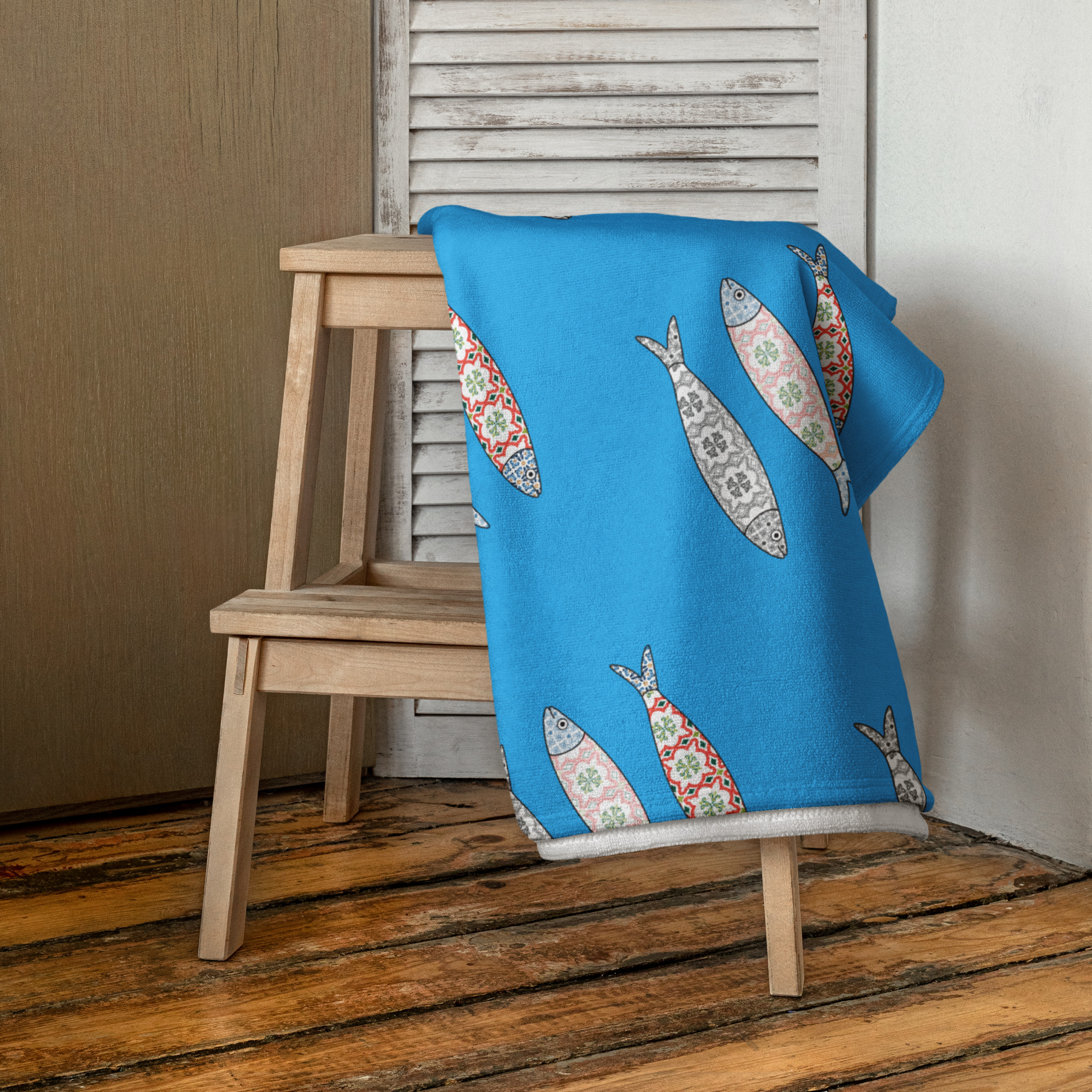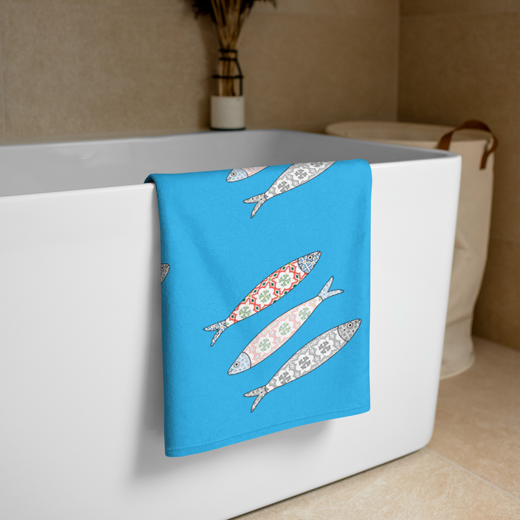 Bring a splash of Lisbon charm to your bathroom with these sky blue towels featuring a playful decorative fish design. Soft, cozy, and super absorbent, they’re perfect for wrapping up after a shower, lounging by the pool, or drying off at the beach. With vibrant all-over sublimation printing on one side and a terry cotton back for maximum absorbency, these towels combine practicality with style.